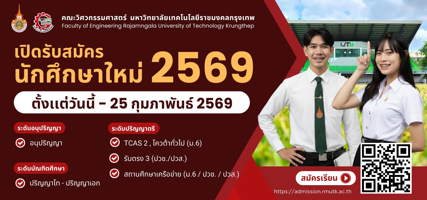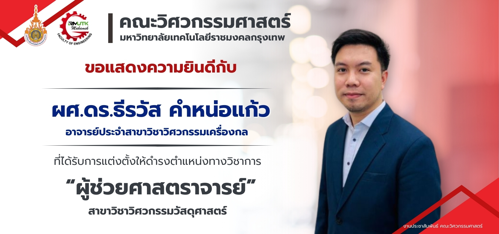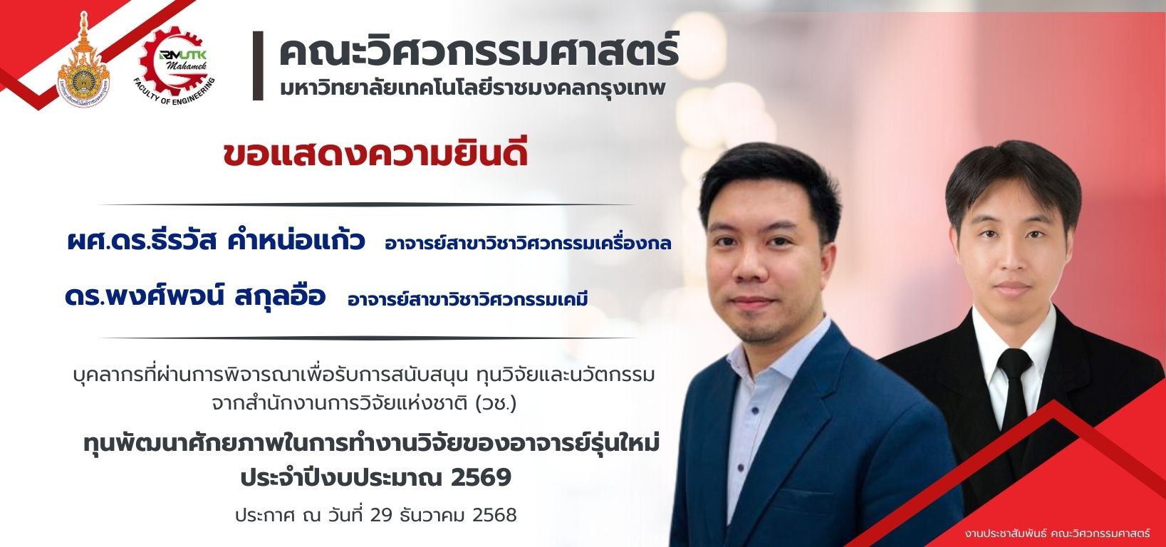 รับสมัครนักศึกษา หลักสูตรทั้งหมด ระบบบัตรประจำตัวนักศึกษา วารสารคณะ ศูนย์บริการทดสอบ จัดซื้อ-จัดจ้าง "เป็นผู้นำในการผลิตวิศวกรที่มีคุณธรรม จริยธรรม มีมาตรฐานสากล และสร้างสรรค์นวัตกรรม เพื่อตอบโจทย์สังคมยุคดิจิทัล" ข่าวประชาสัมพันธ์View All ข่าวประชาสัมพันธ์ คณะวิศวกรรมศาสตร์ เปิดรับสมัครนักศึกษาใหม่ ปีการศึกษา 2569 รอบที่ 3 9 มกราคม 2026 admin ข่าวประชาสัมพันธ์ ๘ มกราคม วันคล้ายวันประสูติ สมเด็จพระเจ้าลูกเธอ เจ้าฟ้าสิริวัณณวรี นารีรัตนราชกัญญา 8 มกราคม 2026 admin ข่าวประชาสัมพันธ์ คณะวิศวกรรมศาสตร์ขอแสดงความยินดีกับอาจารย์ที่ได้รับการสนับสนุนทุนวิจัยจากสำนักงานการวิจัยแห่งชาติ (วช.) 6 มกราคม 2026 admin ข่าวประชาสัมพันธ์ คณะวิศวกรรมศาสตร์ ขอแสดงความยินดีกับ ผศ.ดร.ธีรวัส คำหน่อแก้ว 25 ธันวาคม 2025 admin ข่าวประชาสัมพันธ์ นักศึกษาคณะวิศวกรรมศาสตร์ เข้ารับพระราชทานเหรียญรางวัลเรียนดี ประจำปี 2568 25 ธันวาคม 2025 admin ข่าวประกาศView All ข่าวประกาศประกาศ/คำสั่ง ประกาศผลการคัดเลือกบุคคลเพื่อจ้างเป็นลูกจ้างชั่วคราว ตำแหน่งเจ้าหน้าที่บริหารงานทั่วไป 8 มกราคม 2026 admin ข่าวประกาศประกาศ/คำสั่ง คำสั่งแต่งตั้งคณะกรรมการที่ปรึกษาและคณะกรรมการดำเนินงานการจัดงานพิธีพระราชทานปริญญาบัตร ประจำปีการศึกษา 2567 6 มกราคม 2026 admin ข่าวประกาศประกาศ/คำสั่ง คำสั่งแต่งตั้งผู้ช่วยคณบดีคณะวิศวกรรมศาสตร์ ราย นายธีระทัศน์ โสภากิติบูรณ์ 6 มกราคม 2026 admin ข่าวประกาศประกาศ/คำสั่ง ประกาศรายชื่อผู้มีสิทธิ์เข้ารับการคัดเลือกบุคคลเพื่อจ้างเป็นลูกจ้างชั่วคราว ตำแหน่งเจ้าหน้าที่บริหารงานทั่วไป 29 ธันวาคม 2025 admin ข่าวประกาศประกาศ/คำสั่ง ประกาศรับสมัครคัดเลือกบุคคลเพื่อจ้างเป็นลูกจ้างชั่วคราว ตำแหน่งเจ้าหน้าที่บริหารงานทั่วไป 1 อัตรา 17 ธันวาคม 2025 admin กิจกรรมView All กิจกรรม ENGINEERING GAMES 2025 2 ตุลาคม 2025 admin กิจกรรม Engineering Ambassador 2025 4 กันยายน 2025 admin กิจกรรม การแข่งขันราชมงคลวิชาการวิศวกรรมระดับชาติ ครั้งที่ 16 13 สิงหาคม 2025 admin กิจกรรม พิธีไหว้ครู คณะวิศวกรรมศาสตร์ ประจำปีการศึกษา 2568 31 กรกฎาคม 2025 admin ปฏิทินกิจกรรม "คณะวิศวกรรมศาสตร์"