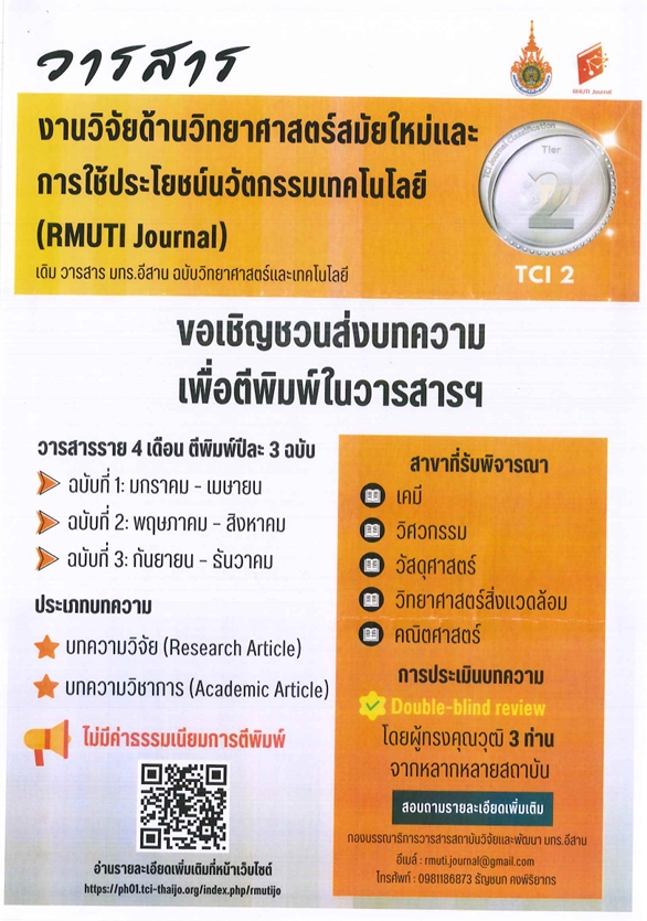 ประกาศรับบทความวิจัย วารสาร งานวิจัยด้านวิทยาศาสตร์สมัยใหม่และการใช้ประโยชน์นวัตกรรมเทคโนโลยี (RMUTI Journal) 9 ตุลาคม 2025 admin 9 Views Post Views: 8