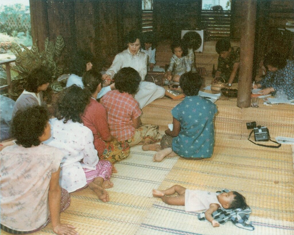 แม้เมื่อเวลาที่เปิดโรงฝึกศิลปาชีพชั่วคราวนั้นที่พระตำหนักในภูมิภาคต่าง ๆ บางคนมีลูกอ่อนเช่นในภาพ ก็จะทรงพระกรุณาโปรดเกล้าฯ ให้เปิดส่วนหนึ่งเป็นสถานที่เลี้ยงเด็กขึ้น และทรงให้ทหารช่วยสอนเด็กที่โตพอจะเรียนหนังสือได้แต่ยังไม่ได้ไปโรงเรียน