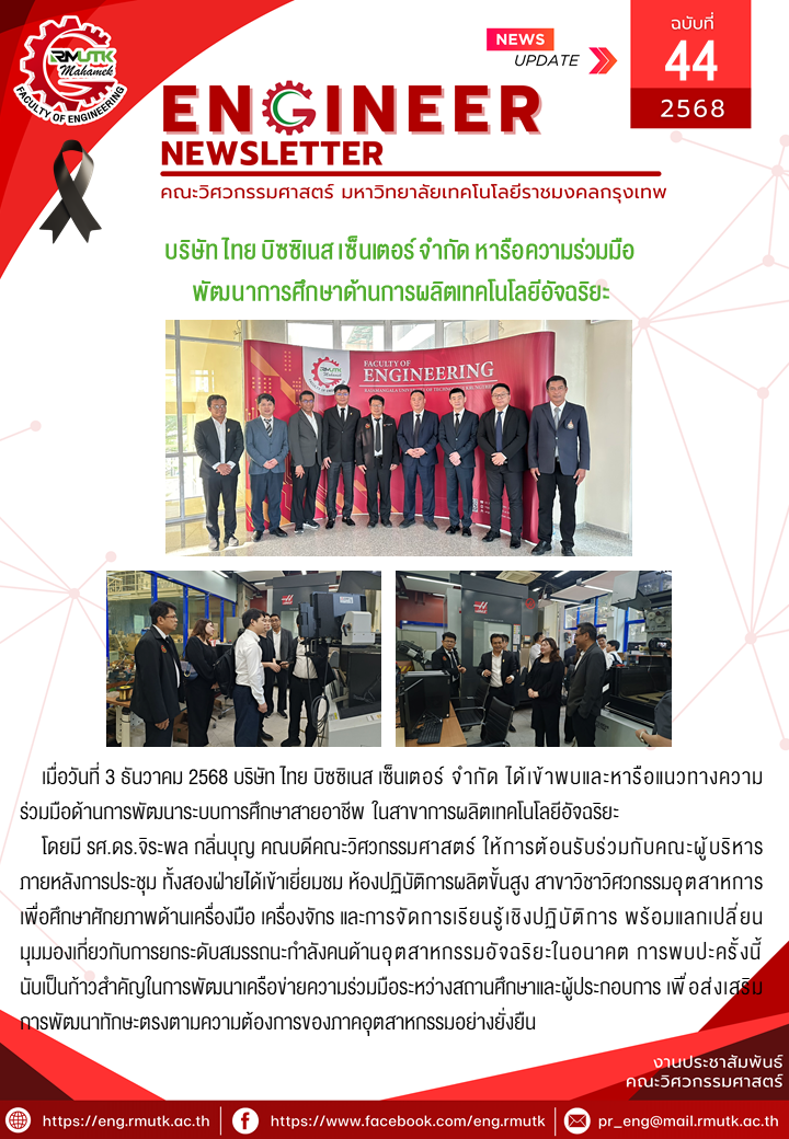 ข่าวประชาสัมพันธ์ บริษัท ไทย บิซซิเนส เซ็นเตอร์ จำกัด หารือความร่วมมือพัฒนาการศึกษาด้านการผลิตเทคโนโลยีอัจฉริยะ 4 ธันวาคม 2025 admin 5 Views Post Views: 5