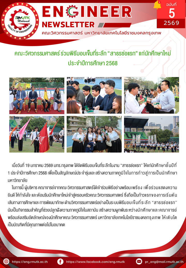 Engineer Newsletter 2569ข่าวประชาสัมพันธ์ พิธีมอบเข็มที่ระลึก “สาธรช่อแรก” แก่นักศึกษาใหม่ ประจำปีการศึกษา 2568 21 มกราคม 2026 admin 8 Views Post Views: 6