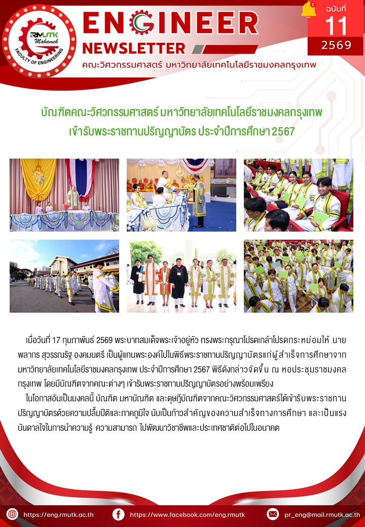 Engineer Newsletter 2569ข่าวประชาสัมพันธ์ บัณฑิตคณะวิศวกรรมศาสตร์ มทร.กรุงเทพ เข้ารับพระราชทานปริญญาบัตร ประจำปีการศึกษา 2567 18 กุมภาพันธ์ 2026 admin 10 Views Post Views: 9