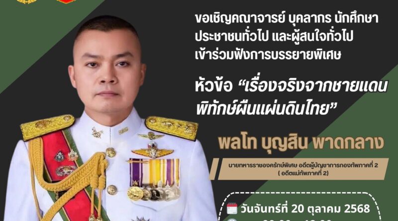 ข่าวประชาสัมพันธ์ ขอเชิญเข้าร่วมรับฟังการบรรยาย “เรื่องจริงจากชายแดน พิทักษ์ผืนแผ่นดินไทย” 3 ตุลาคม 2025 admin 7 Views Read More